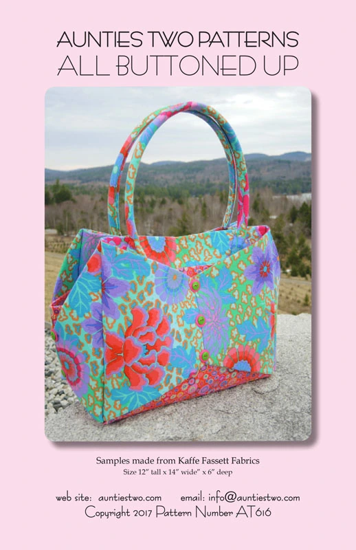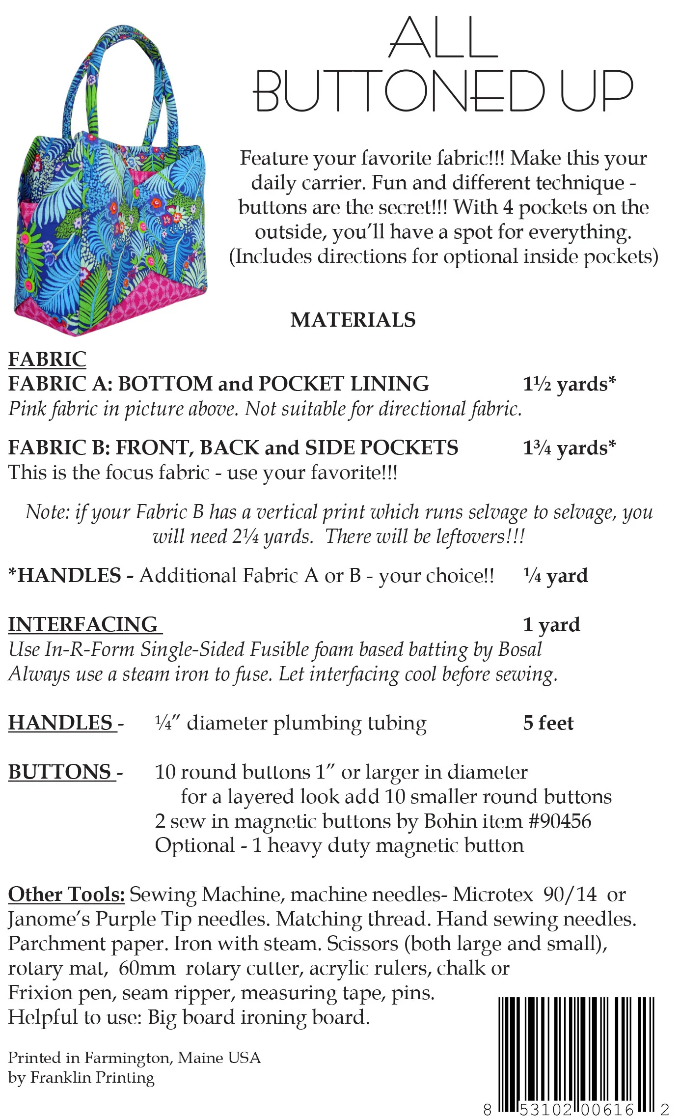 Feature your favorite fabric!! Make this your daily carrier. Fun and different technique – buttons are the secret!! With 4 pockets on the outside, you’ll have a spot for everything. (Includes directions for optional inside pockets).