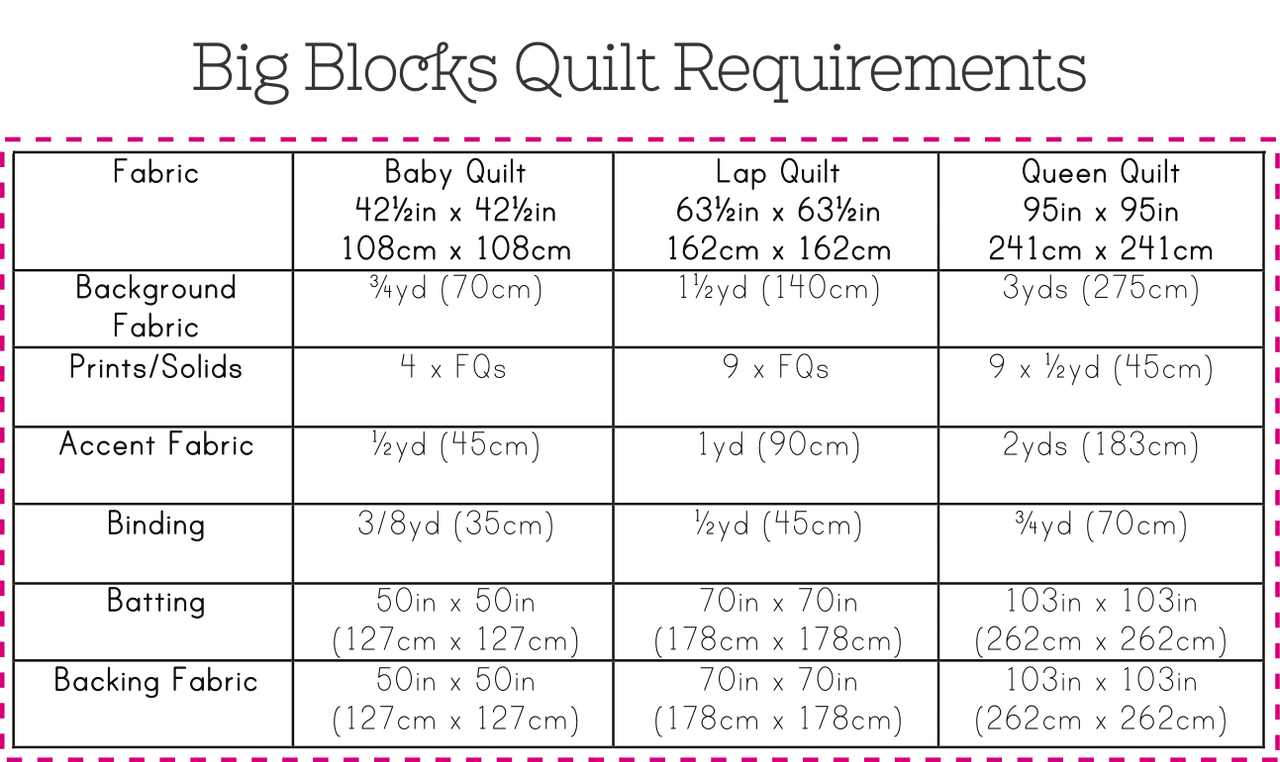 Big Blocks is all about a making a quilt that is fast and fun to finish in no time at all. This design packs lots of punch and is great to use with a range or fabrics from your stash or even make it scrappy. Go big and go bold with this design.