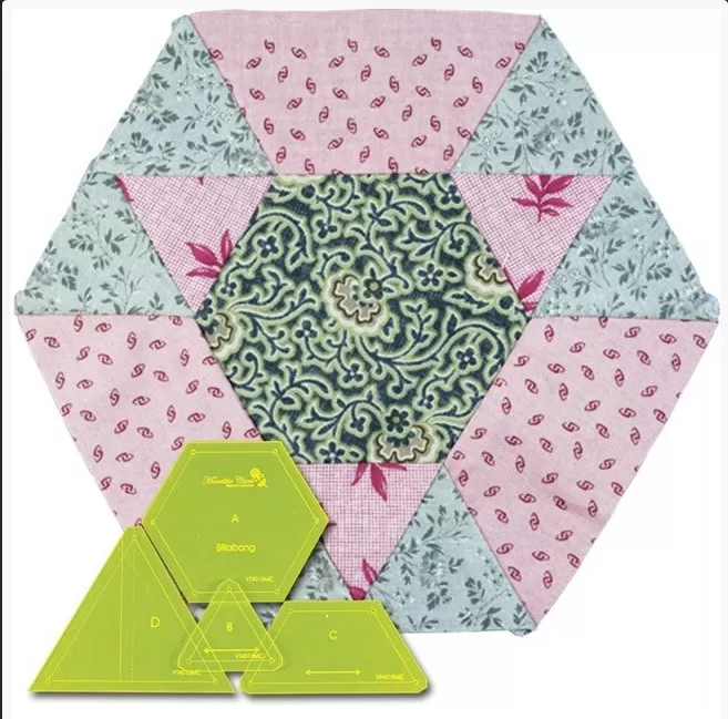 The "Playing With Hexagons" series consists of ; Merry-Go-Round, the Curved Star Hexagon, the Whirligig Hexagon, the Pinwheel Hexagon, Hexagon Slices, Apple Pie, All Pied Up, Billabong, Free Wheelin' and the Diamond Hexagon. With a consistent size of 8", you can mix and match designs!
