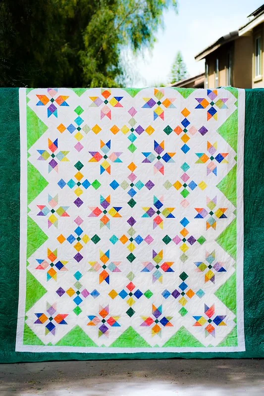 Flower motifs and delicate petal chains blossom across Buds and Blooms, a pattern designed by Daniela Stout for 2.5in strips - but it works great with fat quarters too!
