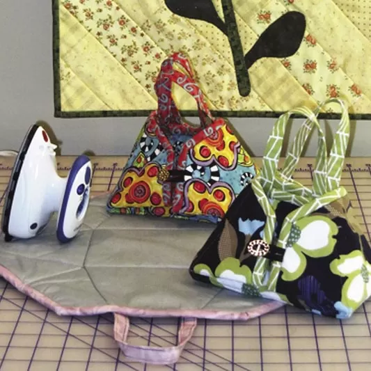 The third size of iron tote/ironing pad - Carries your full size travel iron in style to class or retreat - gives you the ability to pack your iron away "hot" to travel home - no more driving with one hand on the steering wheel and the other carrying the hot iron as we were told once someone did. Opens to a 15 1/2" X 20" ironing surface - and of course, like our others, comes as a Pattern "Plus" with the heat resistant fabric included in the pattern.