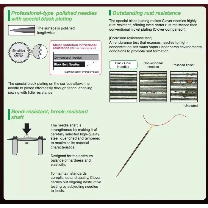 2. Outstanding rust resistance The special black plating makes Clover needles highly rust-resistance, offering even better rust resistance than conventional nickel plating.