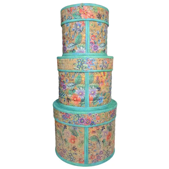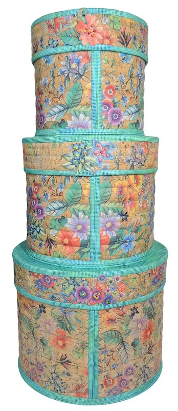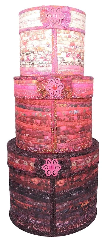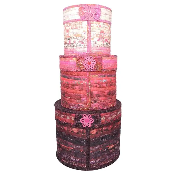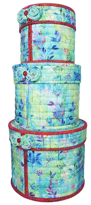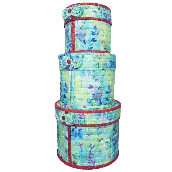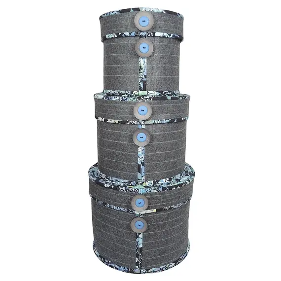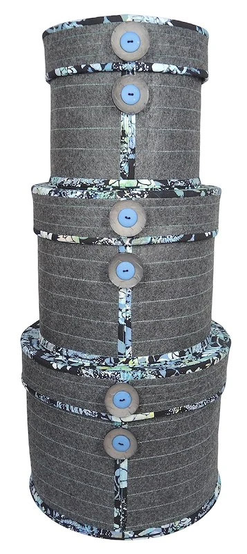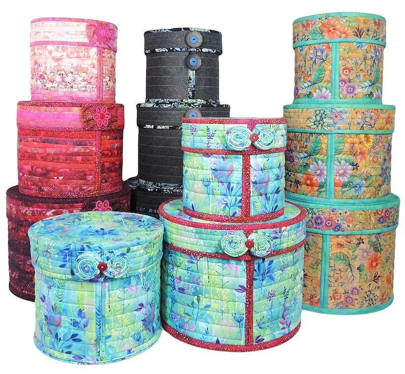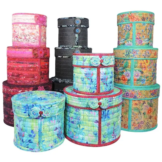 Practical storage in beautiful covered round boxes. Includes instructions for fabric, cork, or pressed felt. 3 Sizes Included