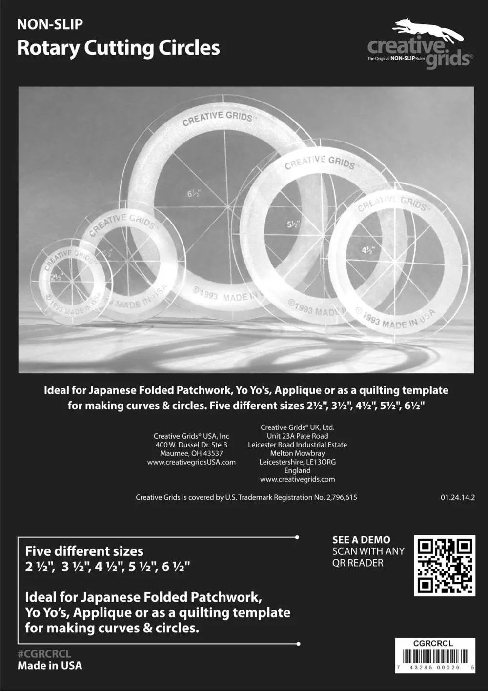 The Creative Grids Non Slip Rotary Cutting Circles is a set of templates in 5 different sizes. 3mm thick acrylic 2" 3" 4" 5" 6" finished sized circles. 45 degree angles are marked on each circle. Use these circles to cut perfect Yo-Yo's, appliques, or as a quilting template for marking curves and circles. Ideal for Japanese Folded Patchwork