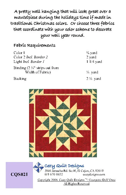 A Cozy Original Pattern! A pretty wall hanging that will look great over a mantelpiece during the holiday time if made in traditional Christmas colors. Or choose three fabrics that coordinate with your color scheme to decorate your wall year round.