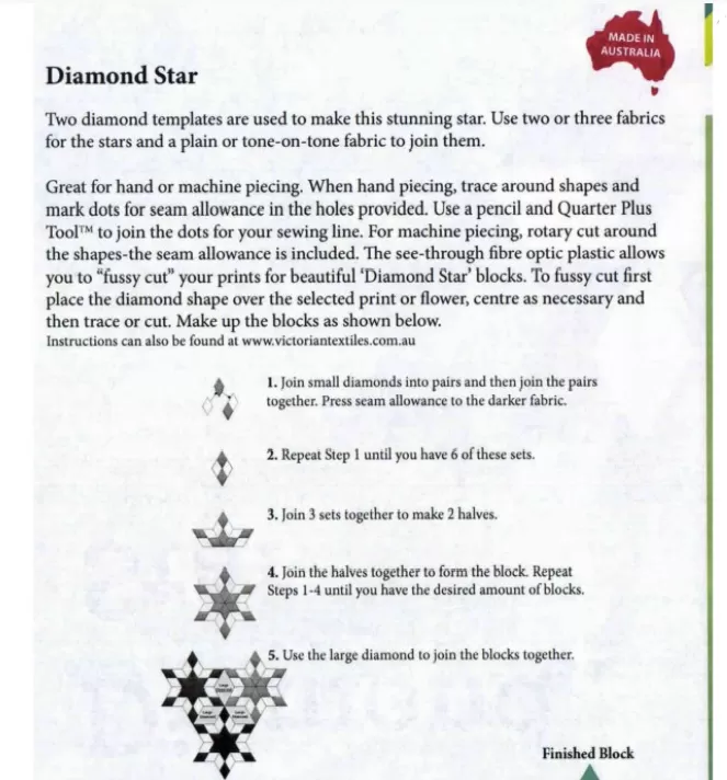Includes printed instructions, ¼” seam allowance and registration holes for marking.