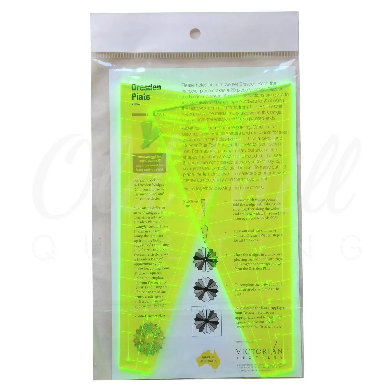 The Small Straight Dresden Plate Template Set contains 2 x 8 Inch Templates, one at 18 degrees and one at 22.5 degrees.