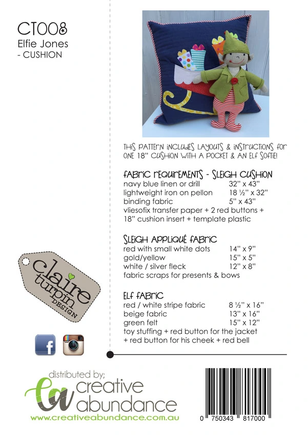 This Pattern includes layouts and Instructions for one 18 Inch cushion with a pocket and includes an elf softie toy