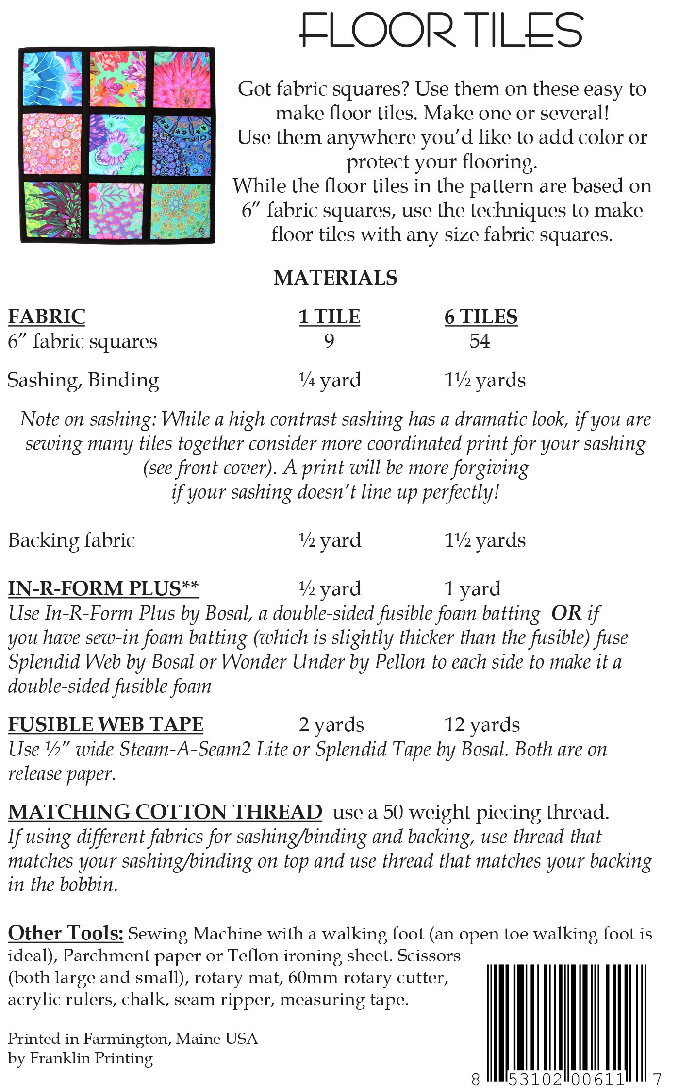 Got fabric squares? Use them on these easy to make floor tiles. Make one or several! Use them anywhere you'd like to add color or protect your flooring. While the floor tiles in the pattern are based on 6in fabric squares, use the techniques to make floor tiles with any size fabric squares.