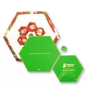 - Cutting: Use the 5" hexagon to cut one shape from batting and one shape from your chosen top fabric. Use the 7" hexagon to cut one shape from your chosen backing fabric.