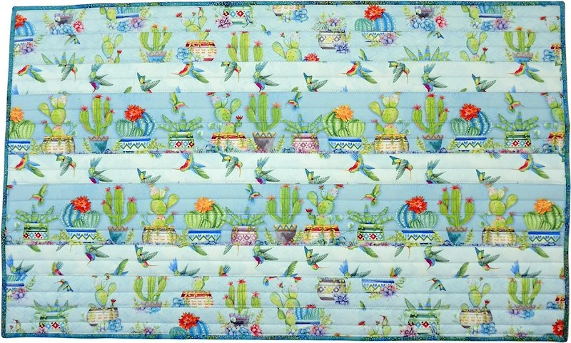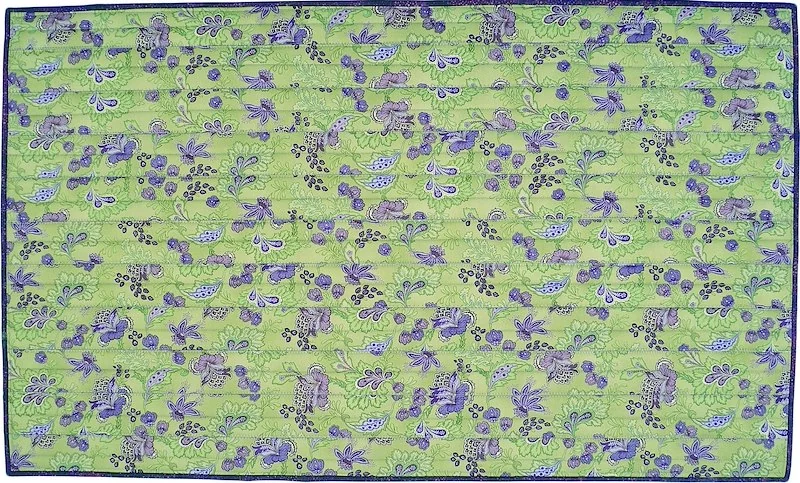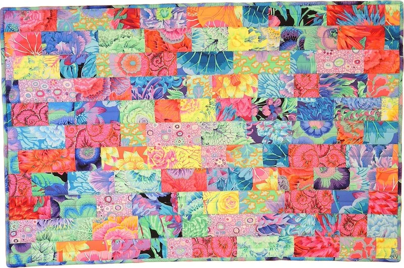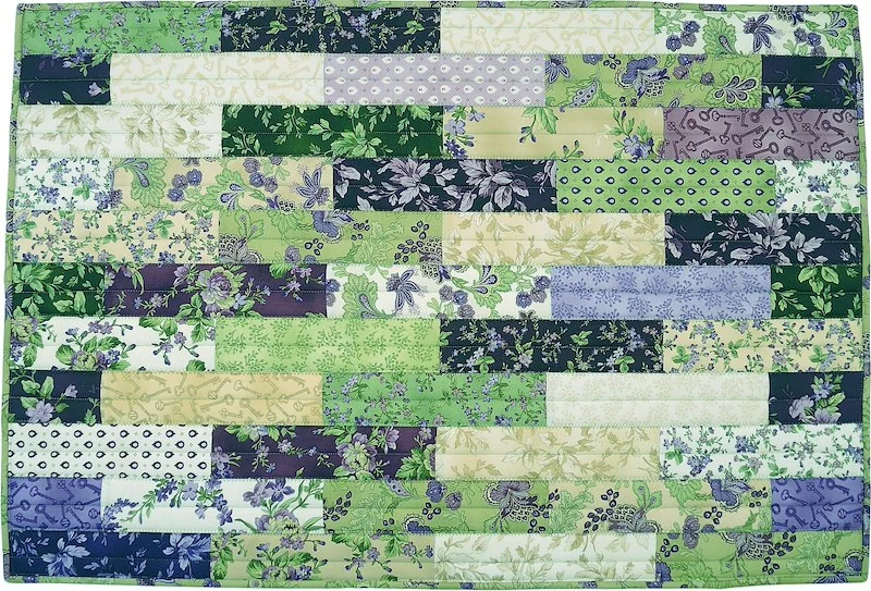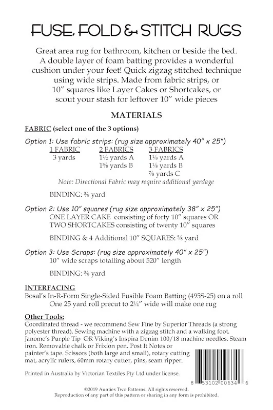Great area rug for bathroom, kitchen or beside the bed. A double layer of foam batting provides a wonderful cushion under your feet! Quick zigzag stitched technique using wide strips. Made from fabric strips, or 10in squares like Layer Cakes or Shortcakes, or scout your stash for leftover 10in wide pieces!