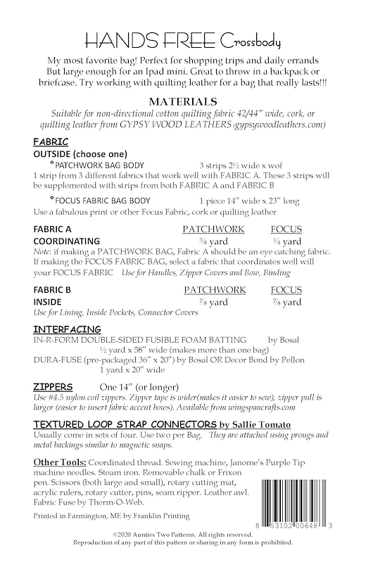 Hands Free Crossbody Bag Pattern AT648 by Aunties Two