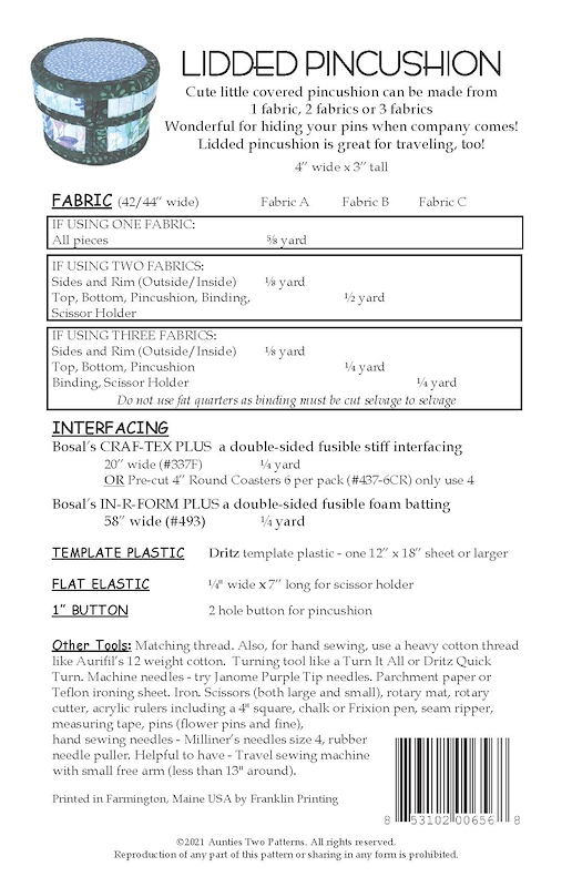 Lidded Pincushion Pattern AT656 by Aunties Two