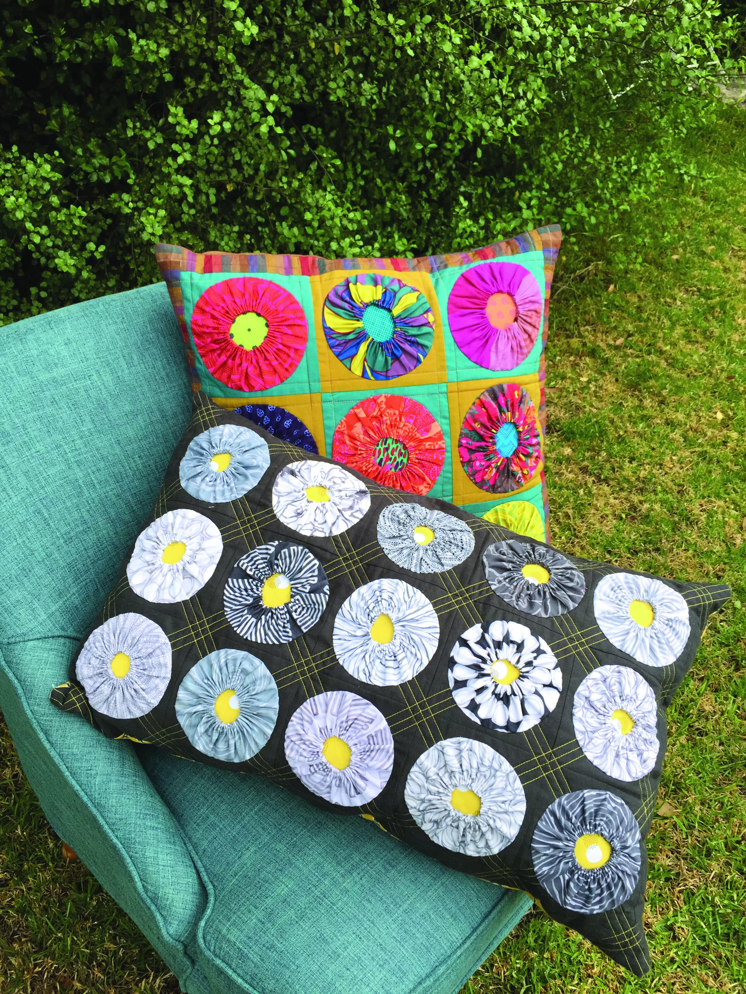 The first design of the Quilt a Pillow series features the Spiderweb block. Big stitch hand quilting in circles finishes the pillow. Use lots of scraps to make the bonus rectangular pillow included in the pattern.