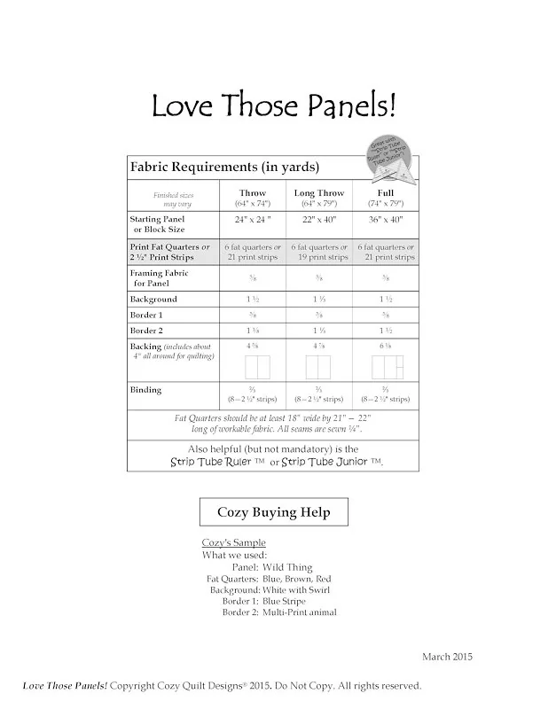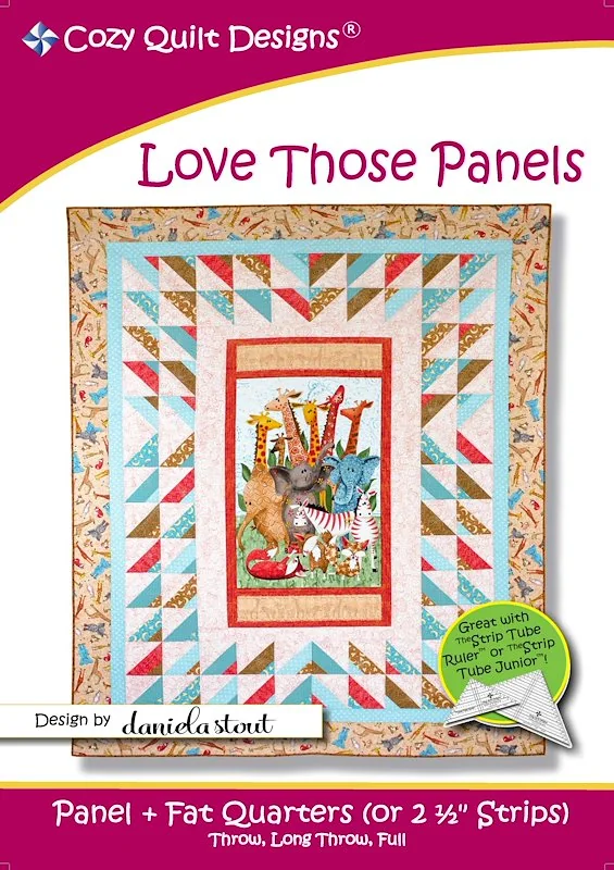 You know that stash of panels you have because you just couldn't live without them? Don't worry, you're not alone! We Love Those Panels too, and now here's a pattern that highlights your favorite panels and can easily incorporate the coordinates. Great (but not mandatory) gadgets for this pattern are the Strip Tube Ruler and the Strip Tube Junior by Cozy Quilt Designs. Works with both 22in and 36in panels!