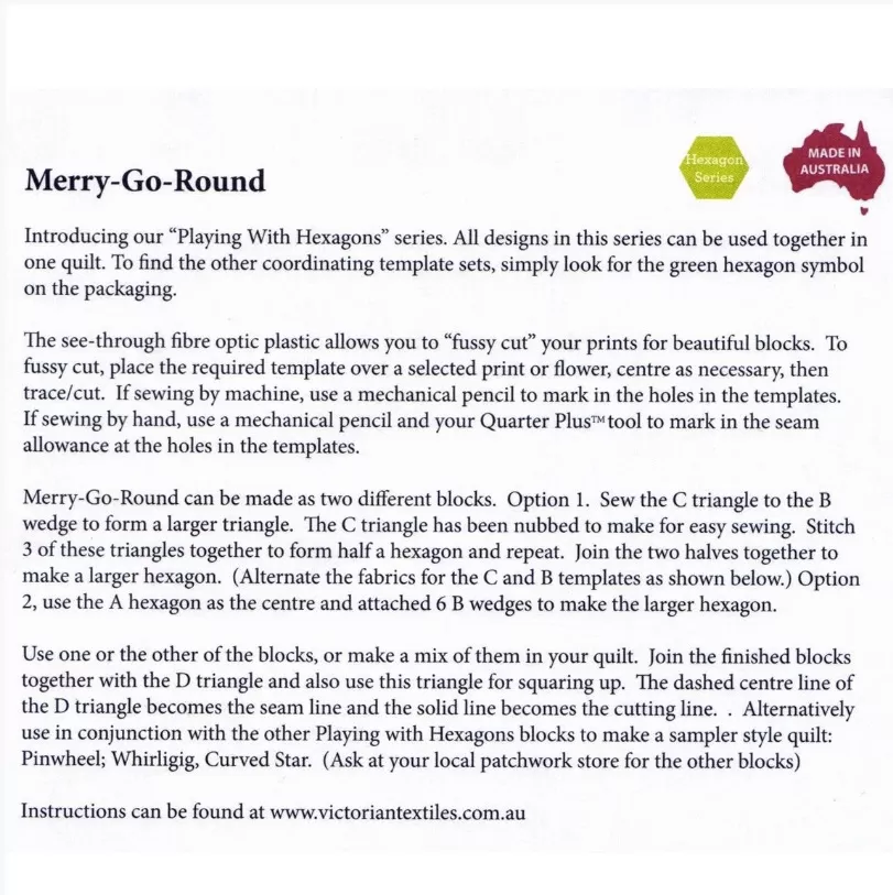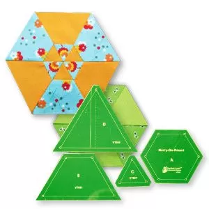 The "Playing With Hexagons" series consists of ; Merry-Go-Round, the Curved Star Hexagon, the Whirligig Hexagon, the Pinwheel Hexagon, Hexagon Slices, Apple Pie, All Pied Up, Billabong, Free Wheelin' and the Diamond Hexagon. With a consistent size of 8", you can mix and match designs!