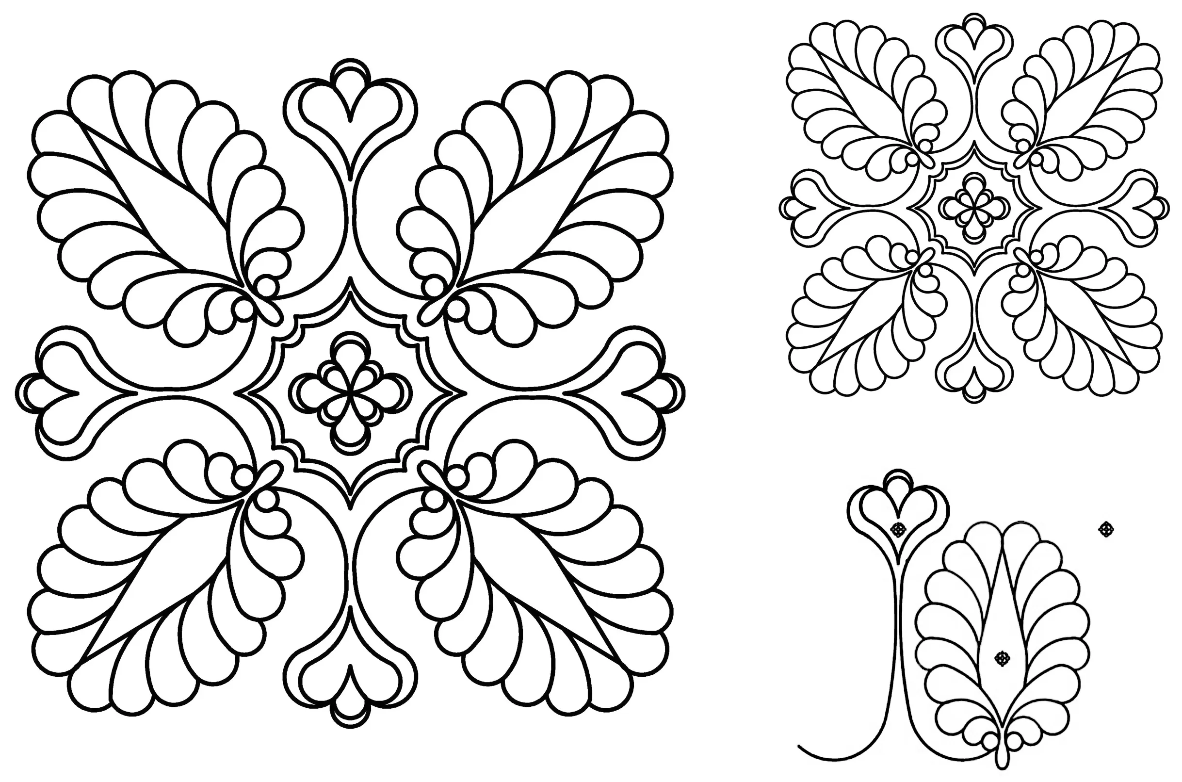 9 1/4". 5 1/2" Sizes of the feather motif and the bonus 4" Matching border.