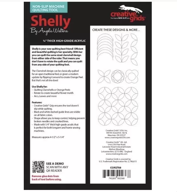 Shelly is your new quilting best friend! Efficient and beautiful quilting is her specialty. With her you can quilt the same sized Clamshell design from either side of the ruler. That means you don't have to rotate the quilt and you can quilt from any side of your quilting foot.