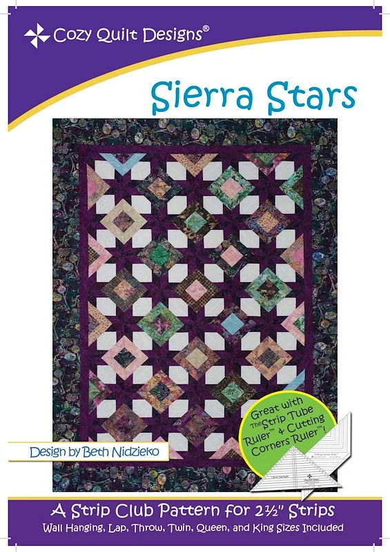 This stunning project looks complicated, but is, in fact, one simple repeating block that is twisted and turned to make a sparkling beauty of a quilt! It all comes to life with a bundle of your favorite 2.5in strips. Just pick your background color and your star fabric and you, too, can create your own collection of Sierra Stars. Our pattern also gives the option of using fabric from your strips to make the stars. Piecing the block is made easier with the Tube Technique. That means you can use Cozy's Strip Tube Ruler to complete your project! (The ruler isn't mandatory, just helpful! Our pattern also includes alternate directions.)