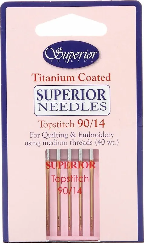 SUPERIOR Titanium-coated Topstitch #90/14. Guaranteed to last 5-8 times longer than regular needles. Pack of 5.